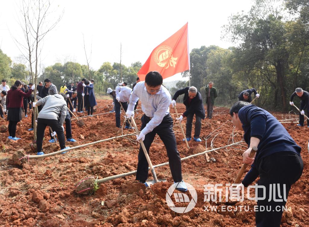 校党委书记万明等校领导与机关全体副处级及以上干部参加义务植树活动。